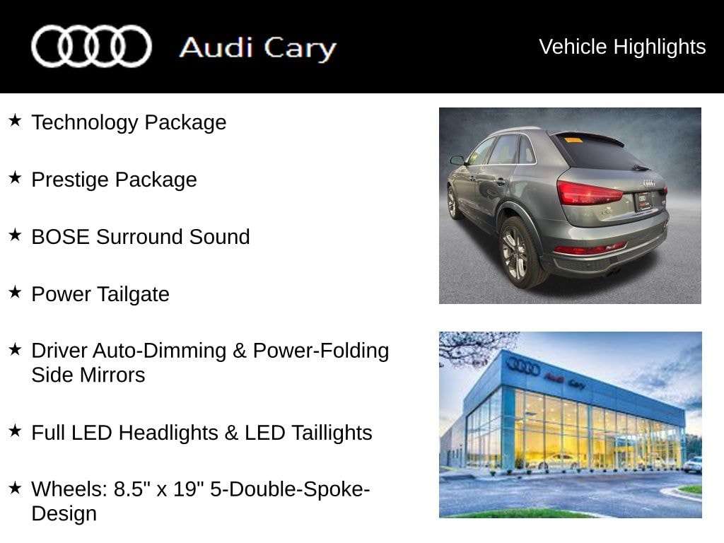 Monsoon Gray Metallic 2016 Audi Q3 2.0T Prestige quattro 6-Speed Automatic with Tiptronic 2.0L 4-Cylinder TFSI quattro CARFAX One-Owner. BOSE Surround Sound, Driver Auto-Dimming & Power-Folding Side Mirrors, Full LED Headlights & LED Taillights, Power Tailgate, Prestige Package, Technology Package, Wheels: 8.5" x 19" 5-Double-Spoke-Design.