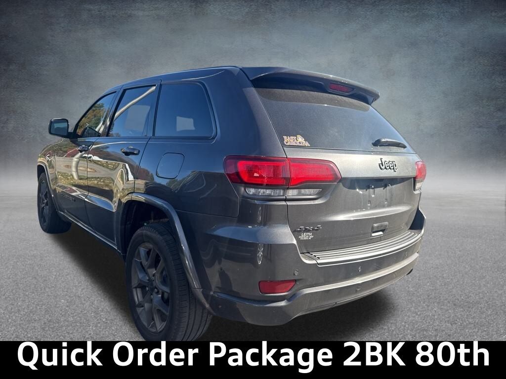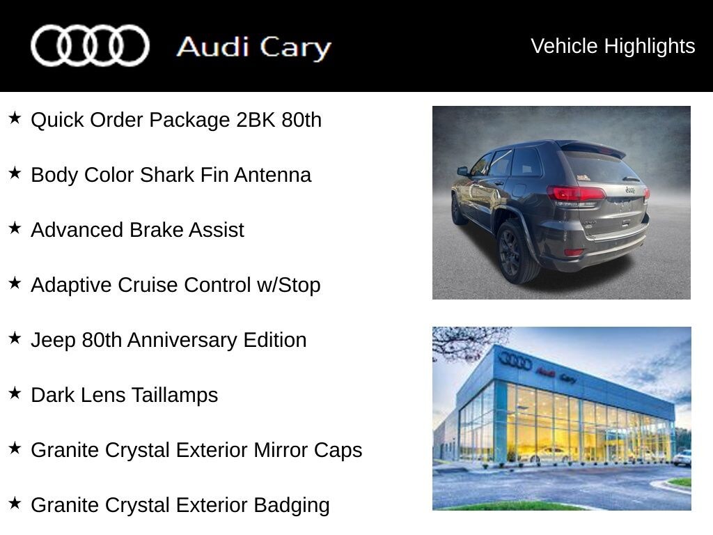 Granite Crystal Metallic Clearcoat 2021 Jeep Grand Cherokee 80th Anniversary Edition 8-Speed Automatic 3.6L V6 24V VVT 4WD CARFAX One-Owner. Clean CARFAX. 4WD, Adaptive Cruise Control w/Stop, Advanced Brake Assist, Berber Floor Mats w/80th Anniversary Tag, Black Roof Molding, Body Color Claddings, Body Color Door Handles, Body Color Shark Fin Antenna, Dark Day Light Opening Moldings, Dark Headlamp Bezel Finish, Dark Lens Taillamps, Front Accent/Body Color Fascia, Full Speed FWD Collision Warn Plus, Granite Crystal Exterior Accents, Granite Crystal Exterior Badging, Granite Crystal Exterior Mirror Caps, Granite Crystal/Black Grille, Jeep 80th Anniversary Badges, Jeep 80th Anniversary Edition, Lane Departure Warning Plus, Leather Trimmed Bucket Seats (JY), LT. Tungsten Interior Accent Stitching, Parallel & Perp Park Assist w/Stop, Piano Black/Anod. Gunmetal Interior Accents, Quick Order Package 2BK 80th, Rain Sensitive Windshield Wipers, Rear Accent/Body Color Fascia, Wheels: 20" x 8.0" Granite Crystal Aluminum.