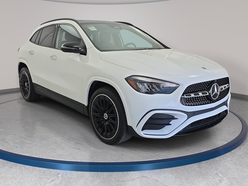 White 2025 Mercedes-Benz GLA GLA 250 2.0L I4 Turbocharged 4-Wheel Disc Brakes, 6 Speakers, ABS brakes, Air Conditioning, Alloy wheels, AM/FM radio: SiriusXM, AMG® Line, Apple CarPlay®/Android Auto®, Auto High-beam Headlights, Auto-dimming door mirrors, Auto-dimming Rear-View mirror, Automatic temperature control, Brake assist, Bumpers: body-color, Burmester® Surround Sound System with Dolby Atmos, Child-Seat-Sensing Airbag, Delay-off headlights, Driver door bin, Driver vanity mirror, Dual front impact airbags, Dual front side impact airbags, Electronic Stability Control, Emergency communication system: eCall Emergency System and Active Emergency Stop Assist, Exterior Parking Camera Rear, Four wheel independent suspension, Front anti-roll bar, Front Bucket Seats, Front Center Armrest, Front dual zone A/C, Front fog lights, Front Power Comfort Seats, Front reading lights, Fully automatic headlights, Garage door transmitter, Heated door mirrors, Illuminated entry, Knee airbag, Leather steering wheel, Low tire pressure warning, MB-Tex Upholstery, Memory seat, Occupant sensing airbag, Outside temperature display, Overhead airbag, Overhead console, Panic alarm, Passenger door bin, Passenger vanity mirror, Power door mirrors, Power driver seat, Power Liftgate, Power passenger seat, Power steering, Power windows, Premium audio system: MBUX, Radio data system, Radio: Mercedes-Benz User Experience (MBUX), Rain sensing wipers, Rear anti-roll bar, Rear fog lights, Rear reading lights, Rear window defroster, Rear window wiper, Remote keyless entry, Security system, Speed control, Speed-sensing steering, Split folding rear seat, Spoiler, Steering wheel mounted audio controls, Tachometer, TBD Axle Ratio, Telescoping steering wheel, Tilt steering wheel, Traction control, Trip computer, Turn signal indicator mirrors, Variably intermittent wipers, Wheels: 18" Twin 5-Spoke.